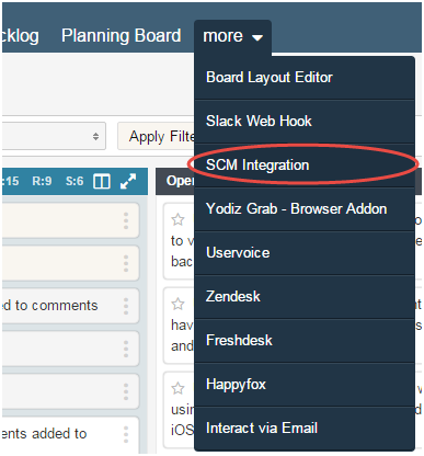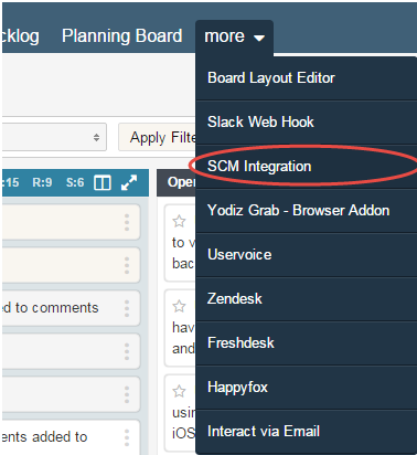 - Login to Yodiz and click on SCM Integrations from "more" navigation menu