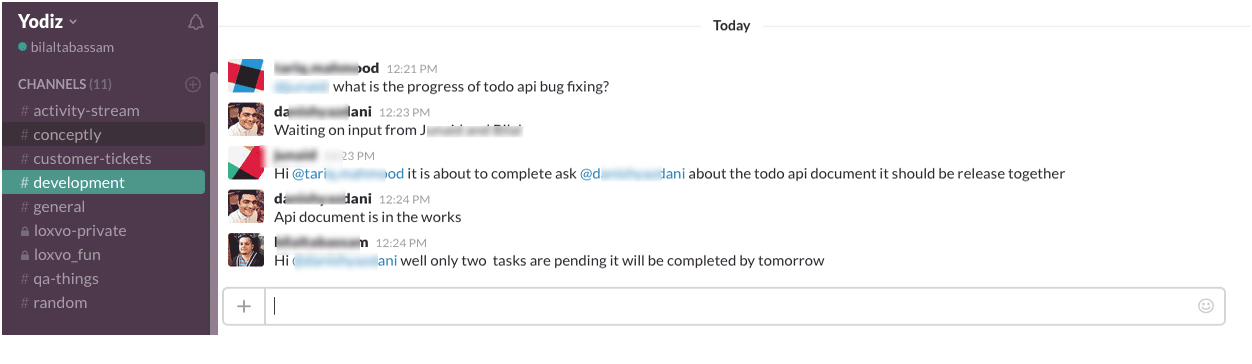 Similarly, our Dev team gains from Slack manifold. The Yodiz notification activity stream is constantly synced with Slack which causes any updates in Yodiz to appear in Slack. This creates an environment of inter connectivity that speeds up the teams processes to unprecedented levels. It also helps to have a separate Channel for the Dev team, where members can discuss procedures. In this way, the Dev team can have these conversations in a separate place, and do not interrupt other communication.