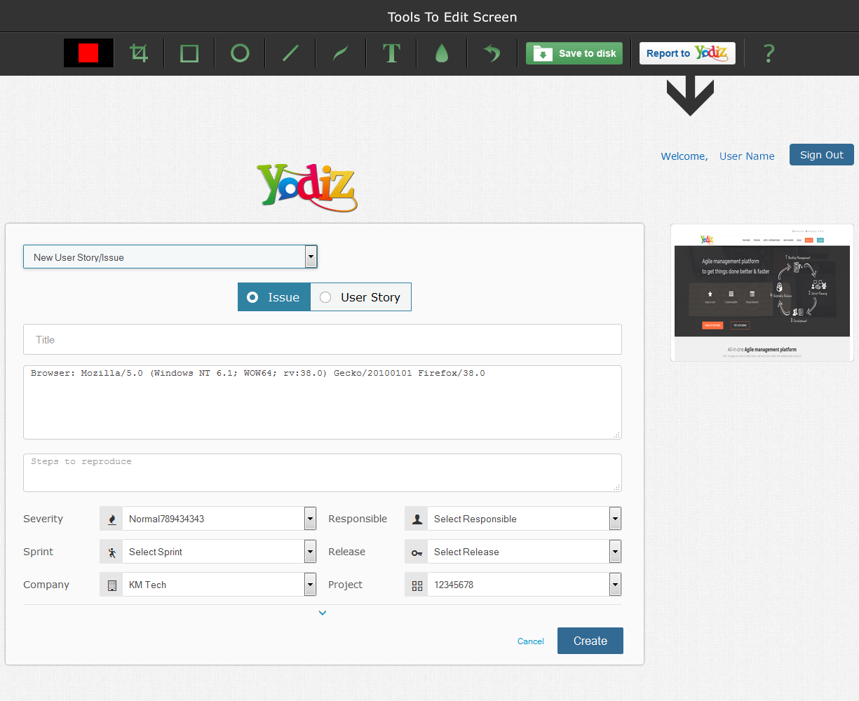 Once image is captured, you can use different drawing tools available at top bar to highlight the problem area or write text. yodiz-grab-tool-bar